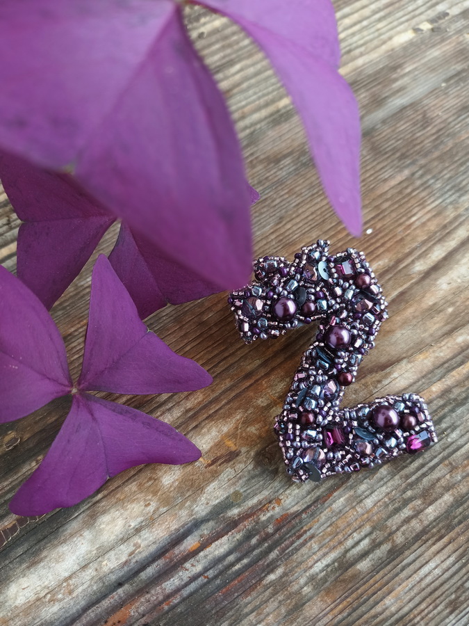 Ručně vyšívaná písmenková brož, v několika fialových odstínech.
