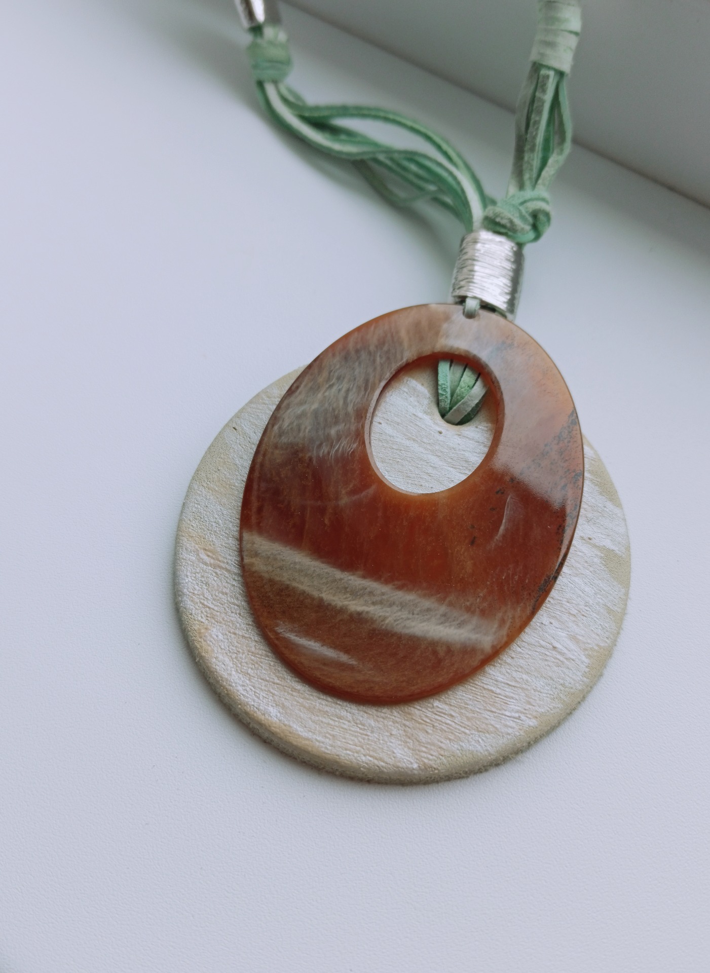 Dlouhý náhrdelník je inspirovaný abstraktní malbou.Bude Vaším dobrým společníkem ke košili i šatům. Je velmi lehký.Vyroben pouze jeden kus.Materiál: kůže, plast, kovPrůměr: 7 cmDélka: 114 cm (včetně přívěsku)Hmotnost: 44g