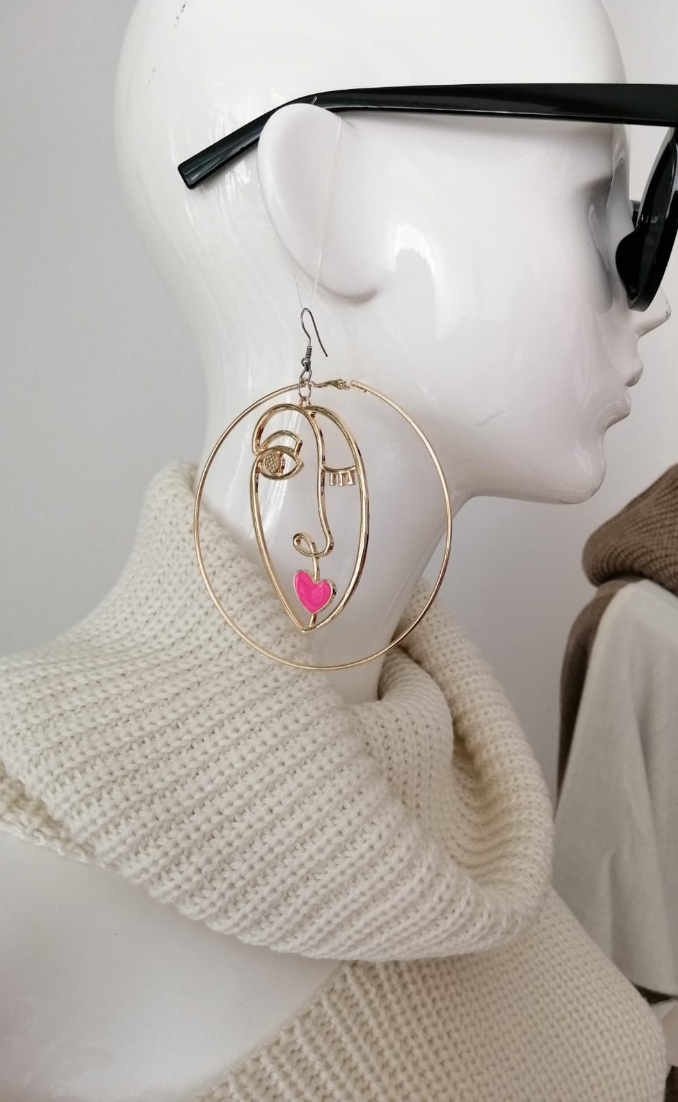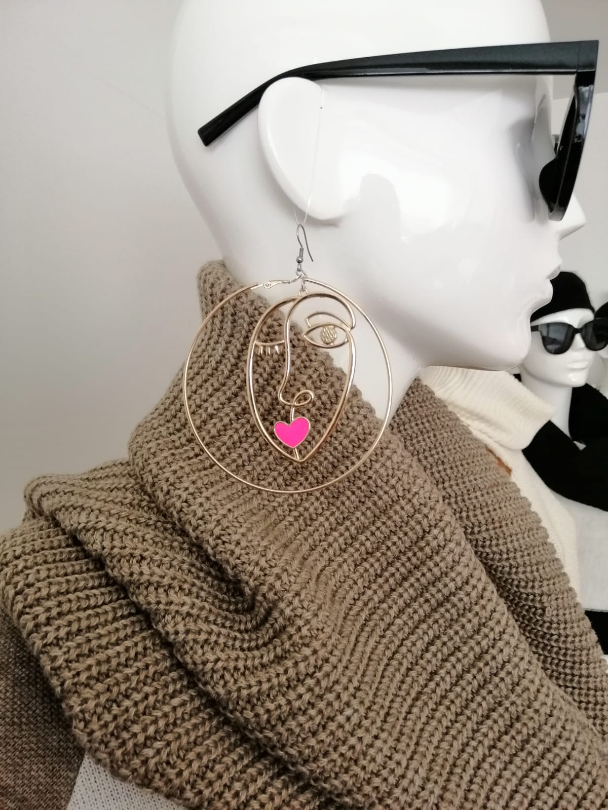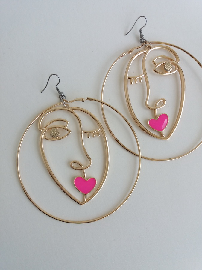 Náušnice vycházejí z tradičního tvaru kruhu, který jsme obohatili o stylizovaný portrét. Jejich zlatou barvu doplňuje jasně růžová.